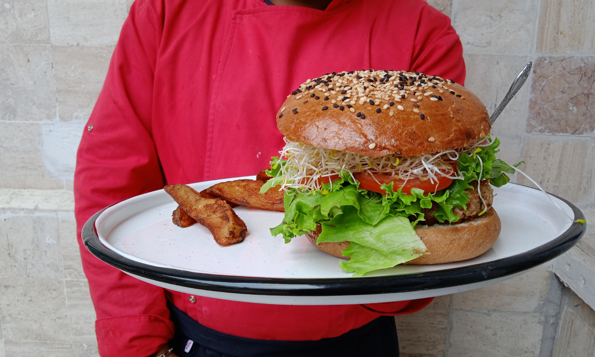 Pan artesanal con pechuga de pollo, manzana, queso de cabra y pepino.